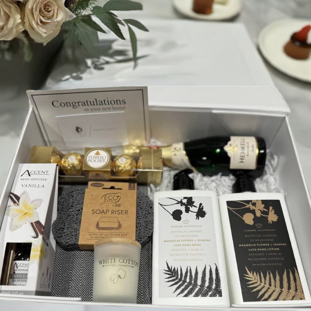 Upgrade the housewarming experience with our Welcome Home - Deluxe gift box! Featuring luxurious handwash and hand cream, a stylish tea towel, a soap riser, a soothing candle, a fragrant air diffuser, and rich chocolate. It’s the perfect mix of relaxation and indulgence.